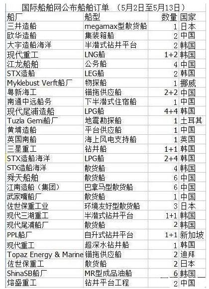 根據(jù)國際船舶網(wǎng)公布的5月2日至5月13日的船舶訂單來看,鉆井船和液化船高端領(lǐng)域的表現(xiàn)異常搶眼;中日韓仍然是世界上訂單最為活躍的三個(gè)國家。其中,韓國在高端造船上顯示出“誰與爭鋒”的氣勢,中國在高端領(lǐng)域亦有所收獲,但仍然以傳統(tǒng)造船為主,日本已經(jīng)走環(huán)保路線。
