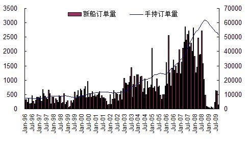 據(jù)英國克拉克松公司統(tǒng)計,今年1-9月全球累計成交新船238艘、1896萬載重噸,同比下降88.3%;截止到2009年9月底,全球手持船舶訂單總量降至8671艘、5.17億載重噸,以載重噸計,較去年10月歷史最高位下降了20%。