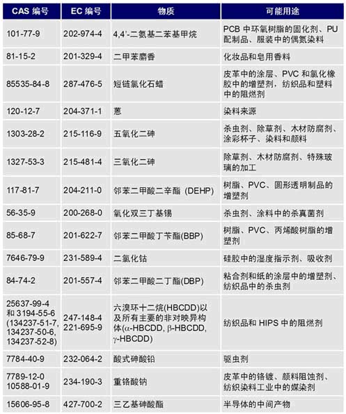 歐盟化學(xué)品管理局(ECHA)已正式將經(jīng)認(rèn)定為高度關(guān)注物質(zhì)(SVHC)的15種物質(zhì)納入授權(quán)使用的候選物質(zhì)清單,并于2008年10月28日在網(wǎng)站上公布有關(guān)這15種SVHC及其可能的用途,詳見下表: