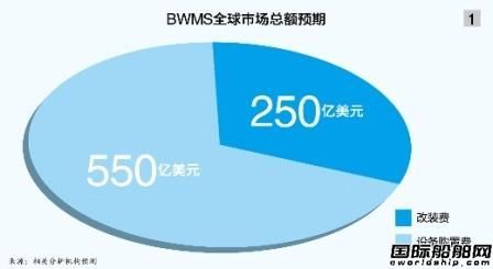 相關分析機構做出預測稱,《壓載水公約》生效后將給BWMS制造商帶來近800億美元的市場總量,對于BWMS這種船配市場的輕量級產品來說,這個數(shù)字是驚人的。另據(jù)某投行交通事業(yè)部的進一步分析,這塊800億美元的“大蛋糕”由占總比68.75%、總額達550億美元的設備購置市場和占總比31.25%、總額達250億美元的改裝市場構成(見圖1)。