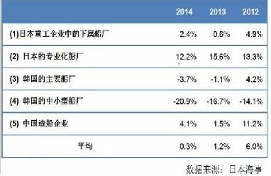 計(jì)算結(jié)果顯示2014年的平均營(yíng)業(yè)收入利潤(rùn)率為0.3%,比2013年下降了0.9個(gè)百分點(diǎn)。這主要是由于韓國(guó)船廠在海工項(xiàng)目上的失利導(dǎo)致了盈利能力急劇惡化,從而拉低了平均水平。與此相對(duì)照,專業(yè)化的日本船廠盡管也略有下滑,但卻仍然保持了高于10%的利潤(rùn)率水平,最高的是日本的新來島船廠,利潤(rùn)率高達(dá)18%。在全球造船業(yè)盈利總體水平幾乎接近于零的情況下顯得格外突出。