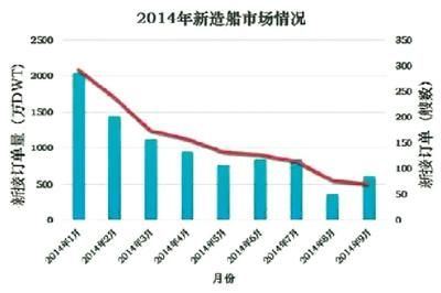 分季度來看,2013年四季度成交3548萬載重噸,2014年前三季度分別成交2213萬、1322萬、864萬載重噸,成一路下滑走勢。8月份更是慘淡,新接訂單量僅為115萬載重噸,9月份從載重噸來看,新接訂單量出現(xiàn)了大幅反彈,但成交艘數(shù)僅為35艘,比8月份的37艘還低。新接訂單載重噸數(shù)的反彈與9月份中遠集團在國內船廠訂造多艘大型集裝箱船、大型散貨船有關。