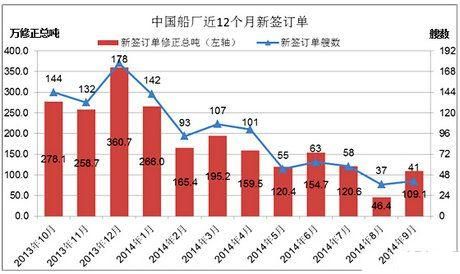據(jù)克拉克松統(tǒng)計,2014年9月,中國船廠新接訂單為41艘, 109.1萬CGT,環(huán)比上升了135.2%,同比下降了44.2%;近12個月,中國船廠的接單量呈先升后降的趨勢,2013年10月至2013年12月,接單量呈上升趨勢;2013年12月至2014年9月,接單量呈下降趨勢;2014年1至9月,中國船廠接單量為1320.5萬CGT,較2013年1至9月下降了16.9%。