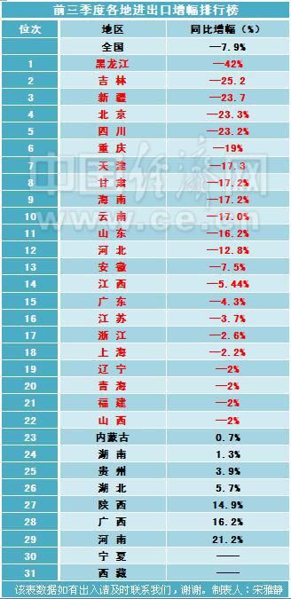 中國經(jīng)濟網(wǎng)記者疏理制作了前三季度各地進出口情況表,表中可以看出外貿(mào)形勢的復雜與嚴峻性,除了寧夏、西藏兩地未公布數(shù)據(jù),在已經(jīng)公布的29個省區(qū)中,有22省區(qū)外貿(mào)進出口值均為負增長。其中黑龍江情況最差,以同下降42%為全國倒數(shù)第一,吉林同比下降25.2%倒數(shù)第二,新疆同比下降23.7%倒數(shù)第三。東北三省在做整體經(jīng)濟不振的情況下,進出口貿(mào)易受到的不良影響也十分明顯。